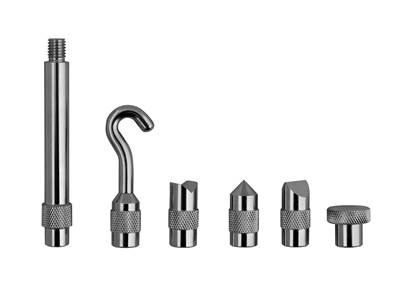 Extension rod, small hook, notched tip, pointed tip, pointed tip, flat head
