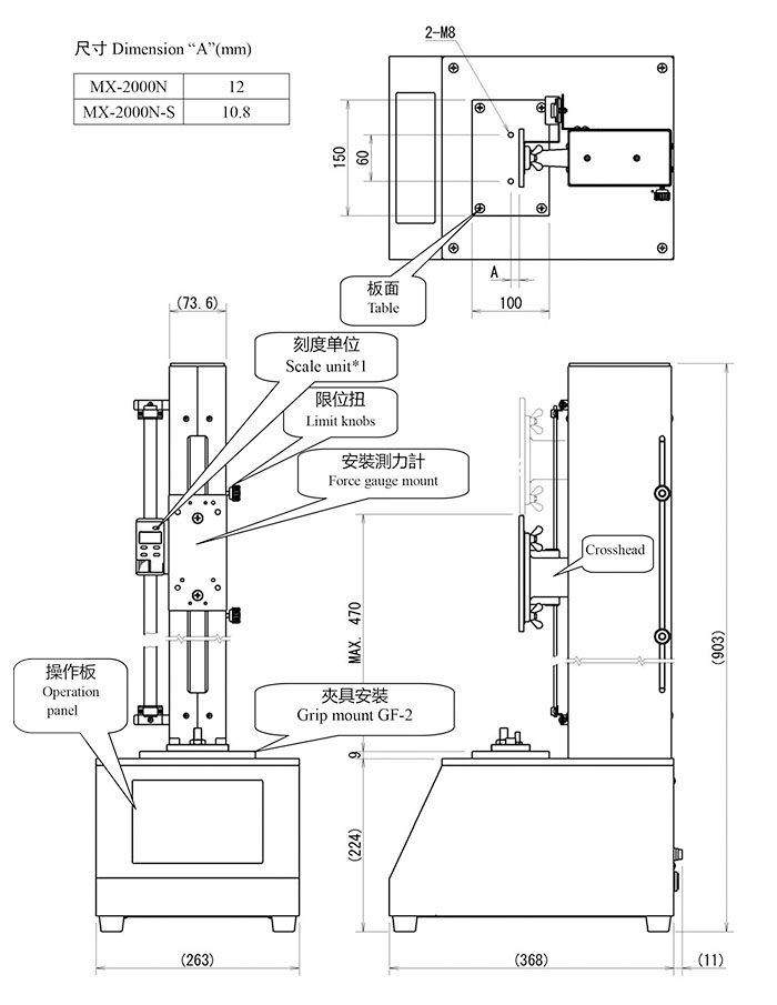 Capacity:2000N(Approx.200kgf)  Stroke with gauge: 410mm